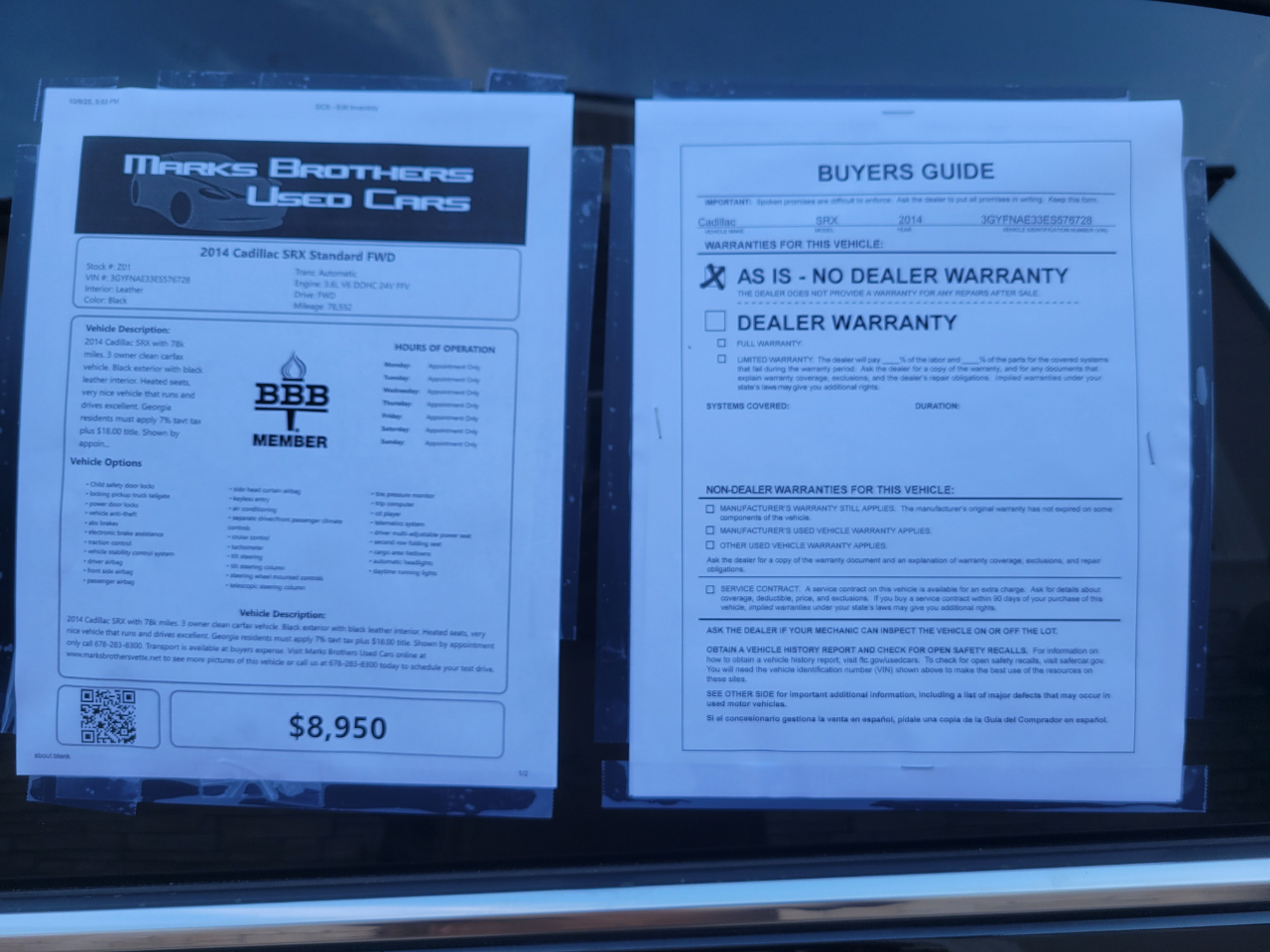 2014 Cadillac SRX with 78k miles. 3 owner clean carfax vehicle. Black exterior with black leather interior. Heated seats, very nice vehicle that runs and drives excellent. Georgia residents must apply 7% tavt tax plus $18.00 title. Shown by appointment only call 678-283-8300.